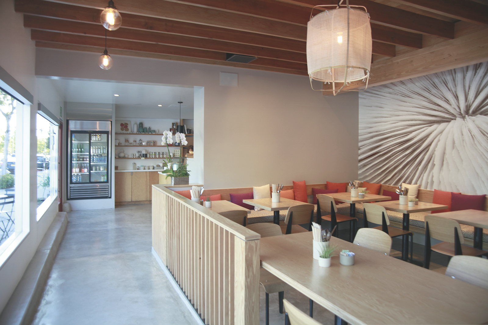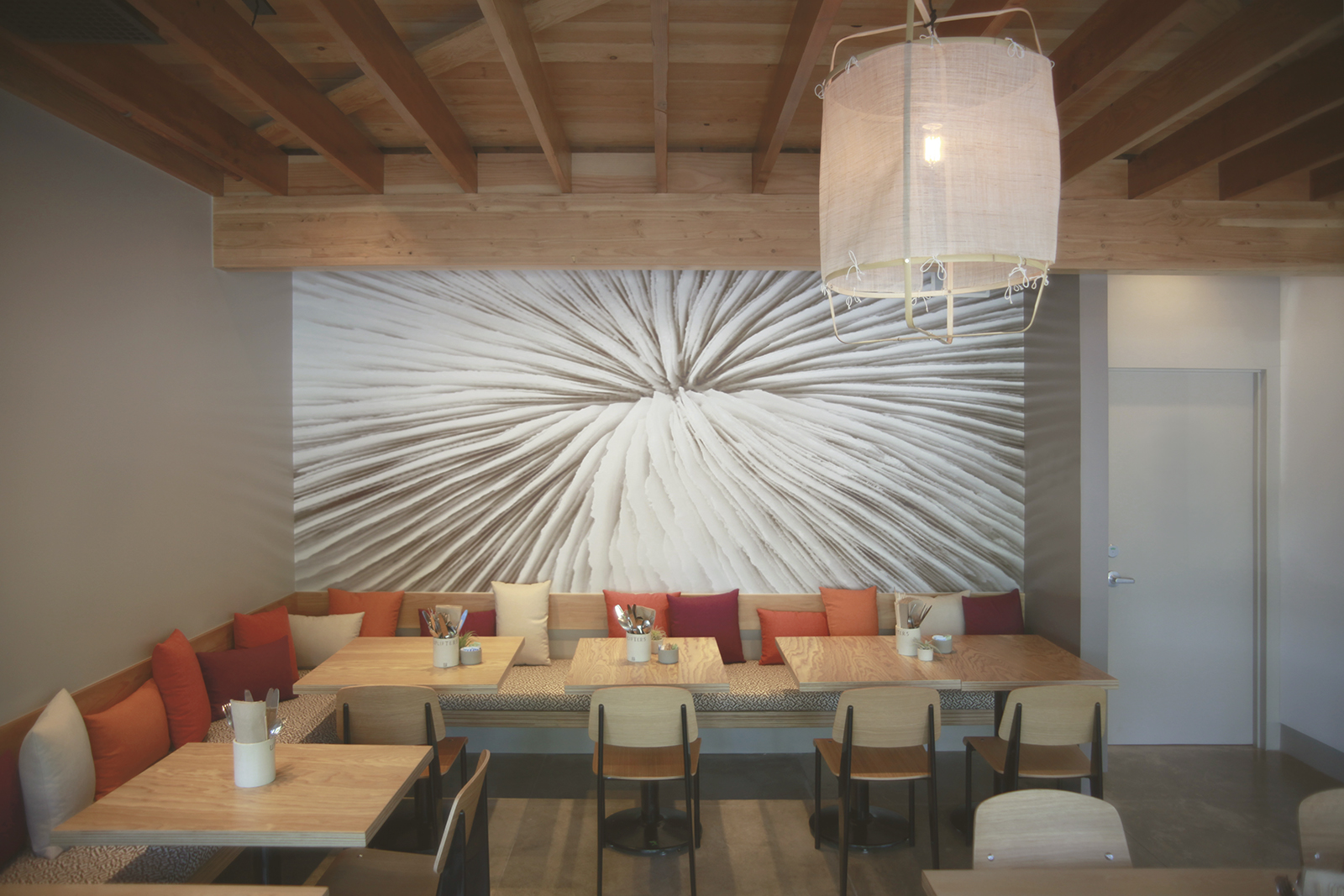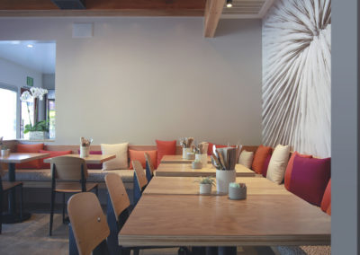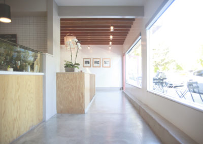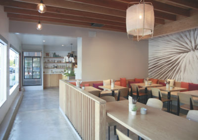 AOY partnered with Uplifters Kitchen in 2014 to design and build a new artisanal cafe serving the Ocean Park district of Santa Monica. The space was completed in two phases in which two adjoining storefronts were completely re-built, renovated and combined into a servery, dining room and commercial kitchen. The ceiling was raised to expose the building structure and the treatment of space throughout incorporated the use of natural materials, wood, tile and concrete to create a soothing and welcoming space for its guests. A feature wall in the dining room was treated with a striking graphic by Fliepaper, a collection of wall covering created by celebrity photographer, Don Flood.